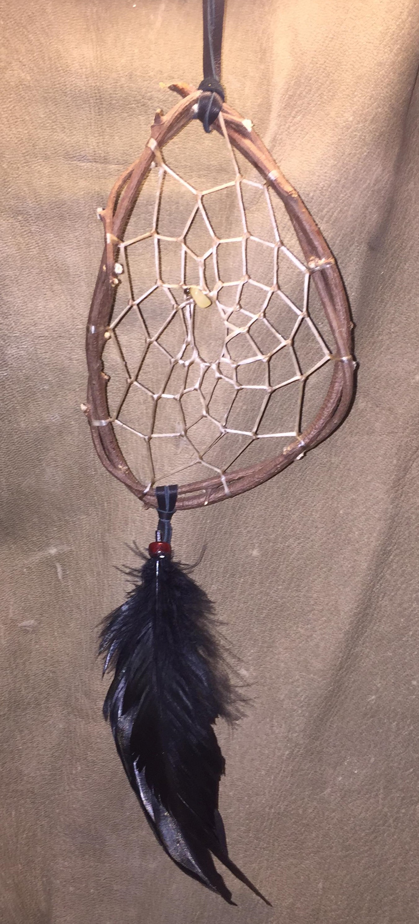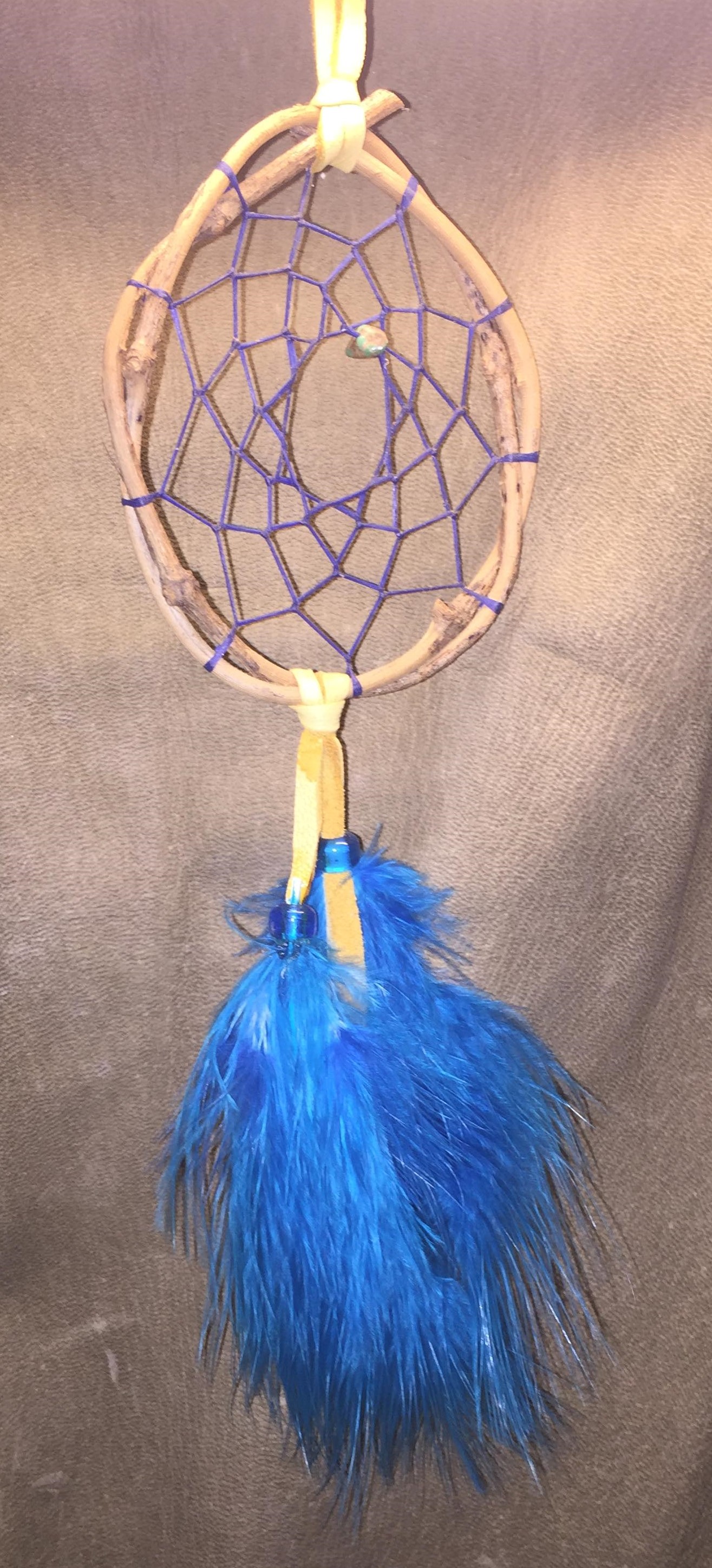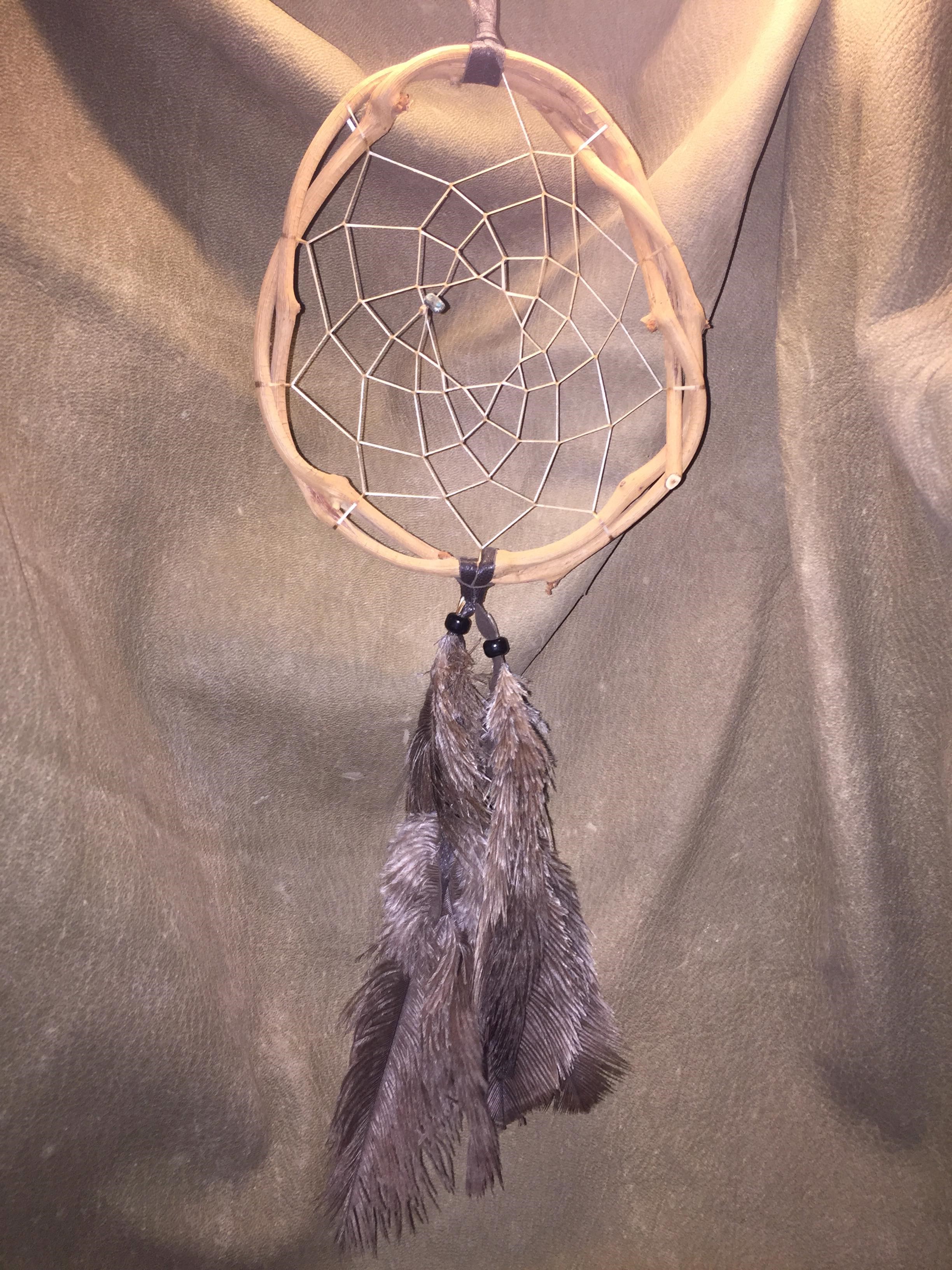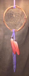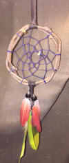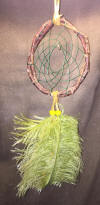 This 2 feathered dream catcher has a 3 inch wide web four inches tall and the feathers drape down a full 6-inches form the bottom of the web.