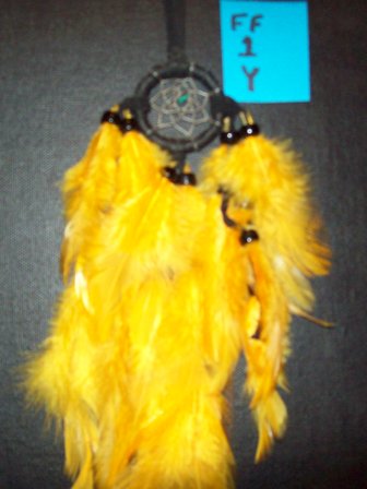This dream catcher has a one and a half inch web and the golden colored feathers drape down a full 8-inches from the bottom of the web.